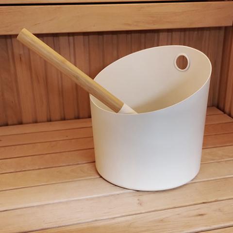 KOLO bucket and ladle set 4 is available in black or white. This multi-functional sauna bucket and ladle set contains a high-quality aluminum bucket with a modern design, along with a matching ladle with a bamboo handle. The ladle has its very own spot built into the bucket so they never have to be apart.