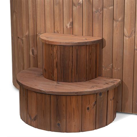 Pre-assembled for easy installation, the natural-colored enhanced Thermo-Pine wood exterior will last up to 2X longer than cedar and has superior thermal resistance. The spacious fiberglass tub contoured for the shape of your body has a 200-gallon water capacity to allow you to submerge in comfort. Matching Thermo-Pine stairs make it easy to get in and out of the tub.