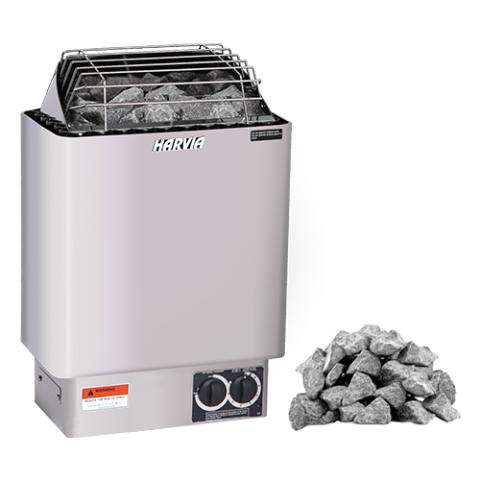 The Harvia KIP 6kW Sauna Heater Package with Built-In Controls comes complete with the KIP60B Sauna Heater and Sauna Stones. This traditional heater has a dual wall construction that allows the exterior to remain cool to the touch and heats up fast in saunas rooms from 170 to 300 cubic feet (CF).