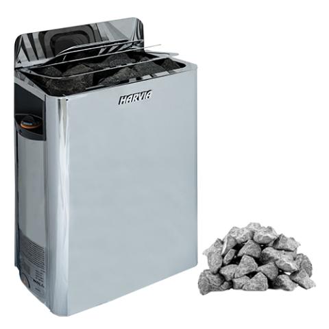 The Wall 6kW Sauna Heater Package with Built-In Controls by Harvia comes complete with The Wall SWS60 Sauna Heater and Sauna Stones. This compact heater package combines modern design with flexible installation options, providing improved air circulation and steady warmth in sauna rooms from 177 to 294 cubic feet (CF).