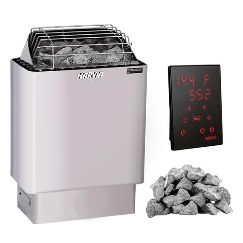 The Harvia KIP 8kW Sauna Heater Package comes complete with the KIP80W Sauna Heater, Xenio Wi-Fi Control, and Sauna Stones. This traditional heater has a dual wall construction that allows the exterior to remain cool to the touch and heats up fast in saunas rooms from 250 to 425 cubic feet (CF).
