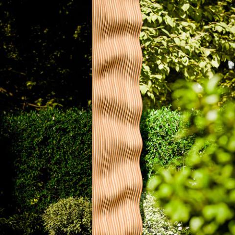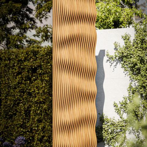 - Thermally modified Ipe Lapacho natural wood exterior prized for durable outdoor use with a unique wave accent design.