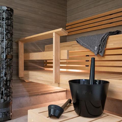 Crafted from recycled materials, the elegant Harvia Click sauna bucket and ladle set features beautiful matte and glossy black details paired with an ergonomic design well suited for modern sauna spaces.