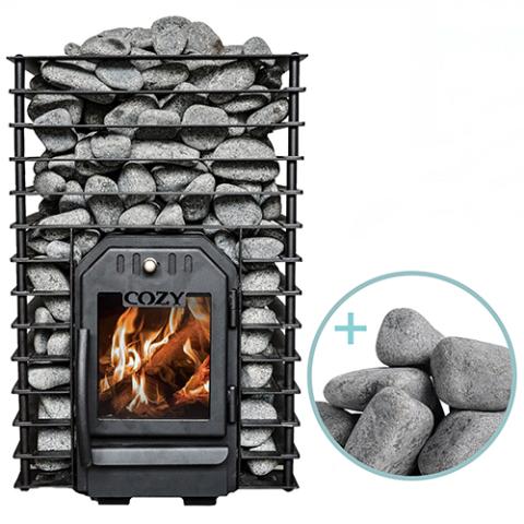 The Cozy Heat Quattro Sauna Stove Package comes complete with the Cozy Quattro Sauna Stove and Sauna Stones. Handcrafted in Estonia, these wood-burning stoves deliver a mild and long-lasting heat and are designed for ladling water over the hot stones to create the perfect steam in sauna rooms up to 635 cubic feet (CF).
