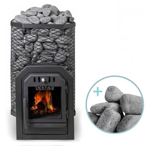 The Cozy Heat Through-Wall Sauna Stove Package comes complete with the Cozy Through-Wall Sauna Stove and Sauna Stones. Cozy has taken the craft of building a wood-fired sauna stove to the next level with this though-the-wall wood-burning sauna stove. Handmade in Estonia, where sauna bathing is a cherished way of life, this wood stove is perfect for intimate sauna spaces.
